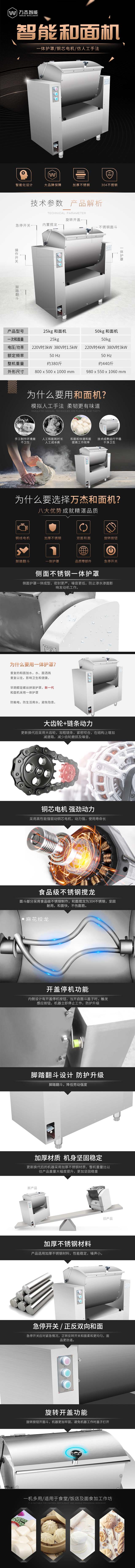 ■ 主要技術(shù)參數(shù): 一次和面量:25KG 產(chǎn)品型號(hào):WJ-HMJ50A 一次和面量:50KG 額定電壓:380V 功 率:3.0KW 外形尺寸:980×550×1060MM 機(jī)器重量:220KG ■ 性能特點(diǎn): 1. 采用腳踏翻斗,降低勞動(dòng)強(qiáng)度 2. 具有掀蓋停機(jī)功能,集成線路板起過(guò)載、短路、缺相、過(guò)壓、欠壓保護(hù)作用,穩(wěn)定系數(shù)高 3. 采用銅線電機(jī),配備好的減速機(jī),穩(wěn)定耐用噪音低 4. 面斗部分采用好的不銹鋼制作,和面攪龍為304不銹鋼,堅(jiān)固耐用,美觀大方 ■ 產(chǎn)品介紹: